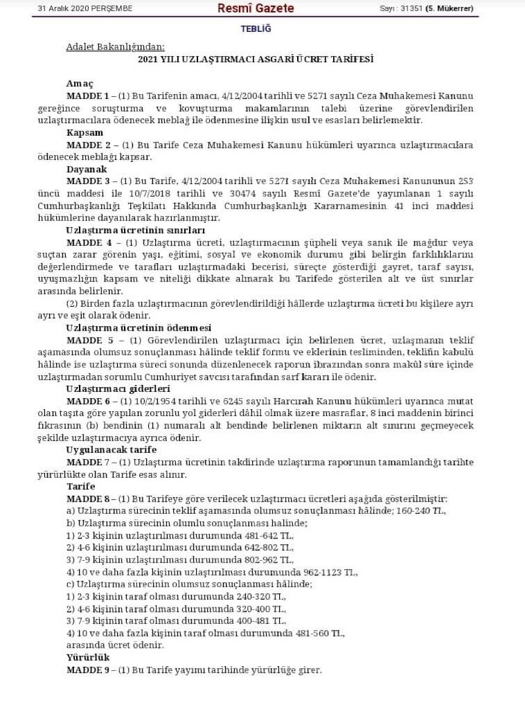 2021 yılı uzlaştırma ücret tarifesi yayımlanmıştır.